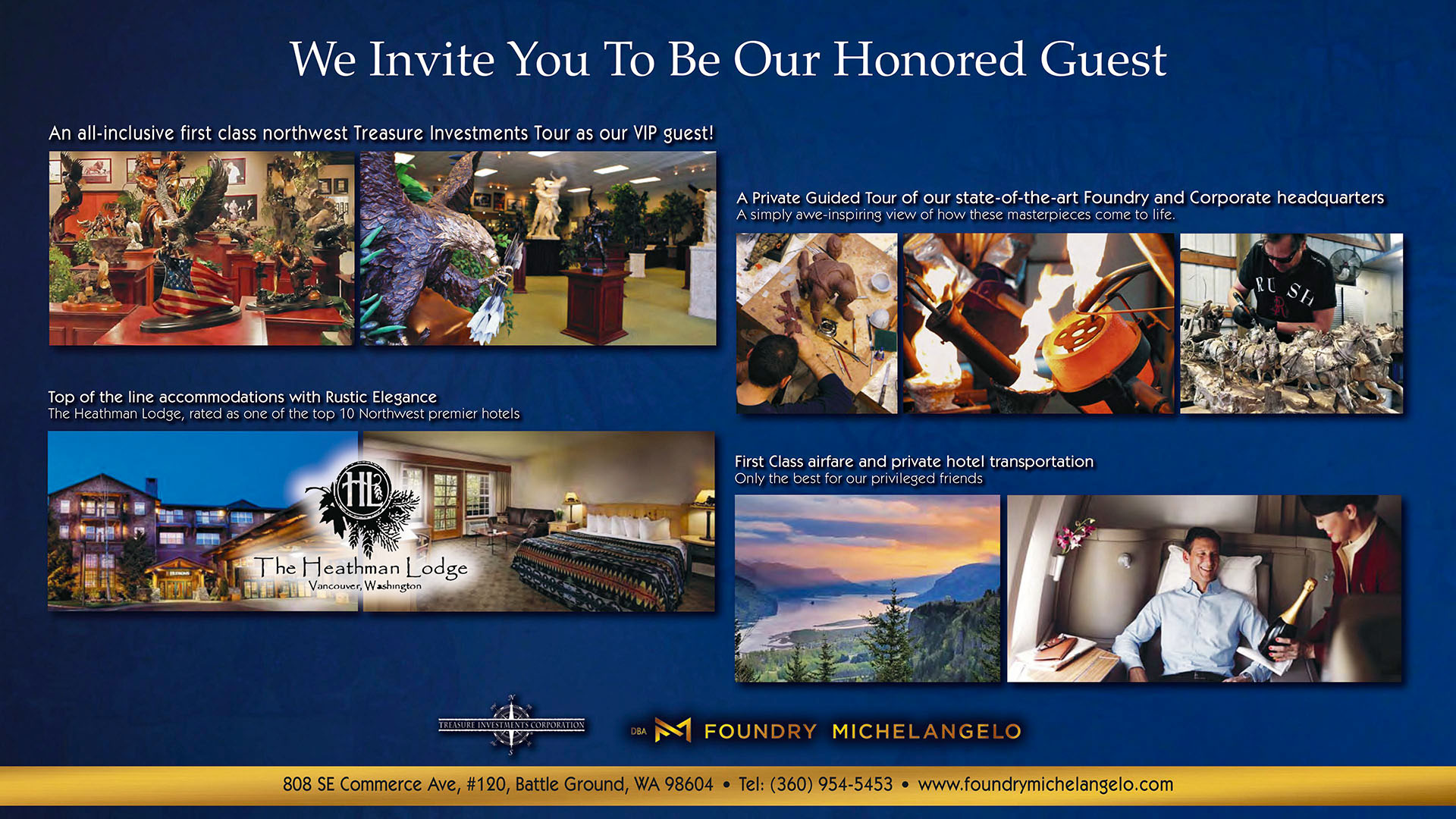 We would love to welcome you to visit our headquarters and discover for yourself what it takes to create a Treasure Investments and Foundry Michelangelo Masterpiece. A once in a lifetime experience!